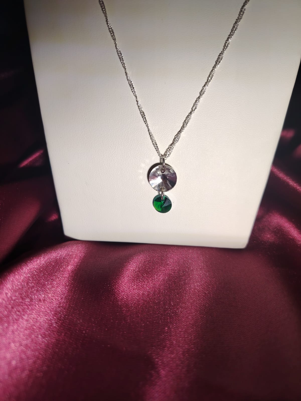 Esta pieza viene acompañada de dos delicados cristales Swarovski: uno traslúcido y de mayor dimensión, y otro en un elegante tono verde esmeralda, más pequeño pero igualmente encantador. Ambos aportan un brillo sutil y sofisticado, haciendo de esta cadena una joya perfecta para usar tanto de día como de noche.